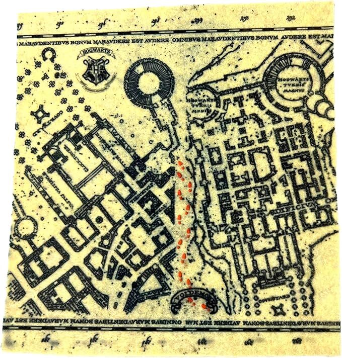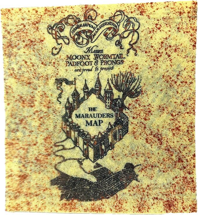 It is a detailed representation of the three most important wizards from Harry Potter in a seated position, holding the iconic Marauder's Map.